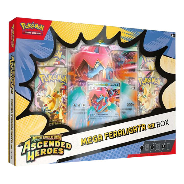 De Mega Evolution Ascended Heroes Box laat je de kracht van Mega Meganium ex, Mega Emboar ex of Mega Feraligatr ex ontdekken. Deze set bevat een schitterende foil promokaart, een oversized lenticulaire kaart met dynamisch artwork en 4 Ascended Heroes boosterpacks vol nieuwe Pokémon om mee te vechten.